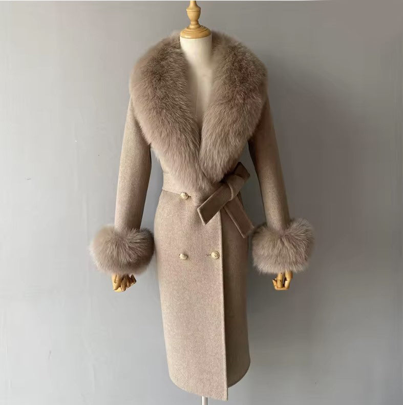 Manteau en laine camel, col et poignets en fourrure naturelle "Encanto de Lã"